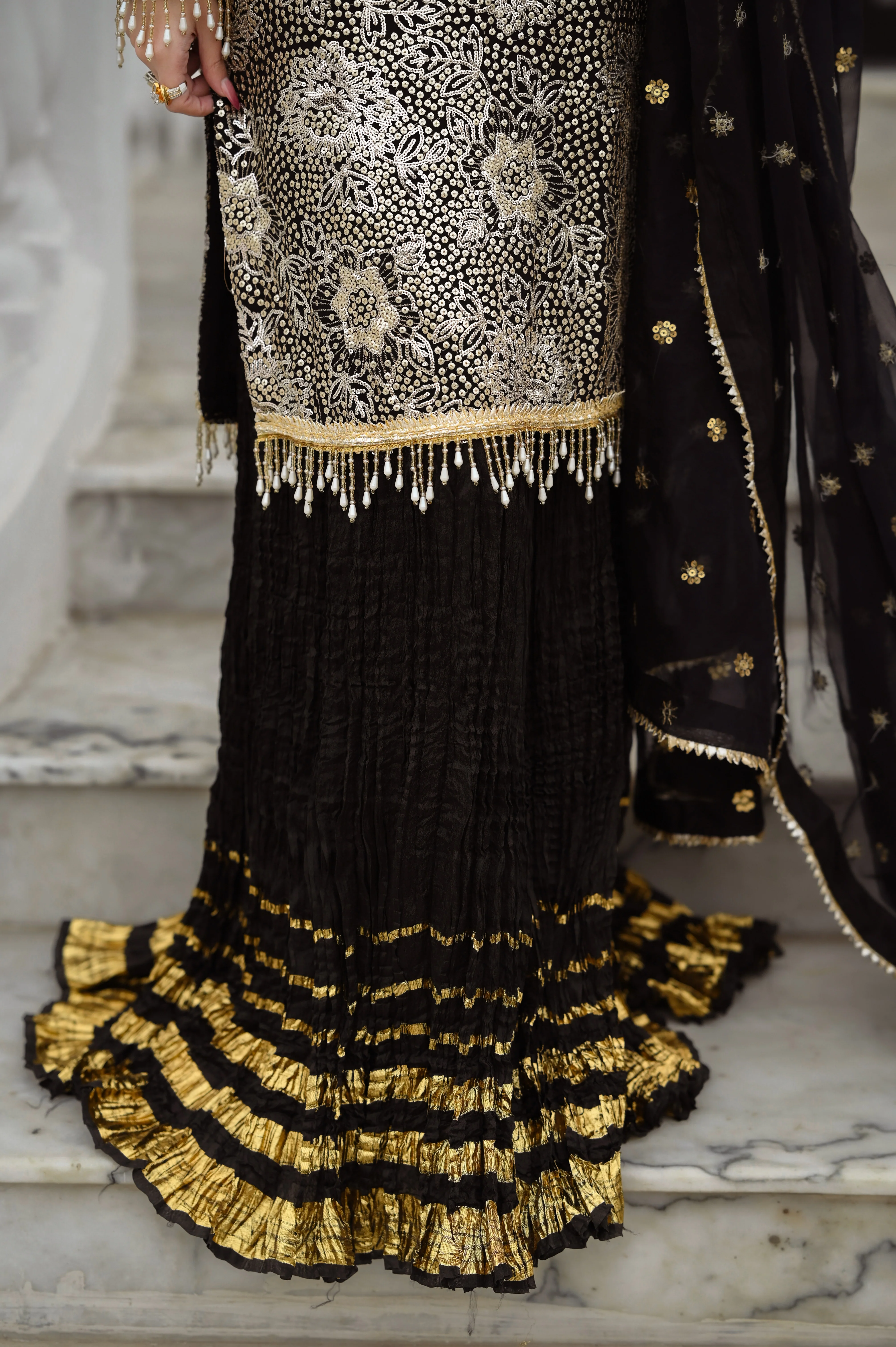 Black shirt embellished with gold and silver sequins and a full length glittery silk sharara paired with a zari organza dupatta.