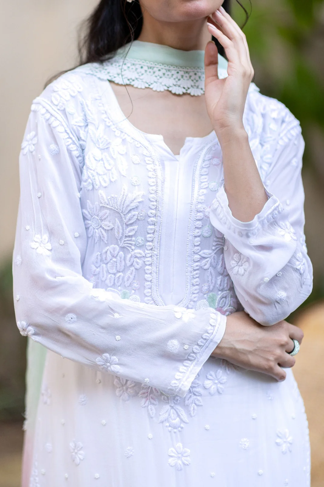 This luxurious pure chiffon shirt is adorned with intricate hand-embroidered Chikankari, meticulously crafted to perfection. Each piece is further elevated with shimmering pearls, cutdana, and delicate sequins, creating a truly opulent feel.