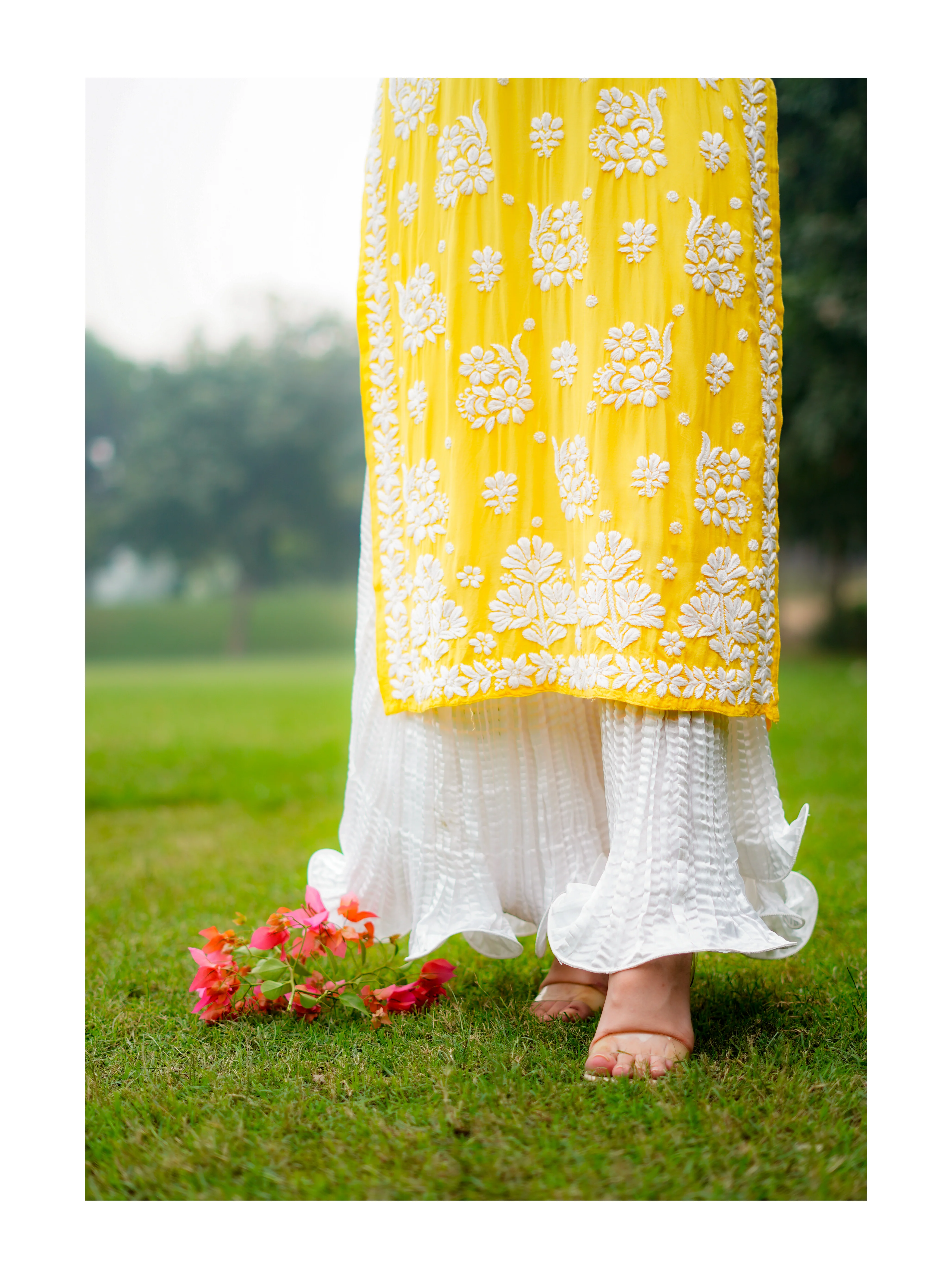 A Premium handmade Chikankari straight fit kurta in luxurious muslin silk soft on skin double shaded in yellow tones. Its airy and lightweight fabric exudes a redefined grace consisting of delicate embroidery on the front back and sleeves. Crafted with exquisite detail, the exquisite clothing is perfect for formal occasions, special events, and beyond.